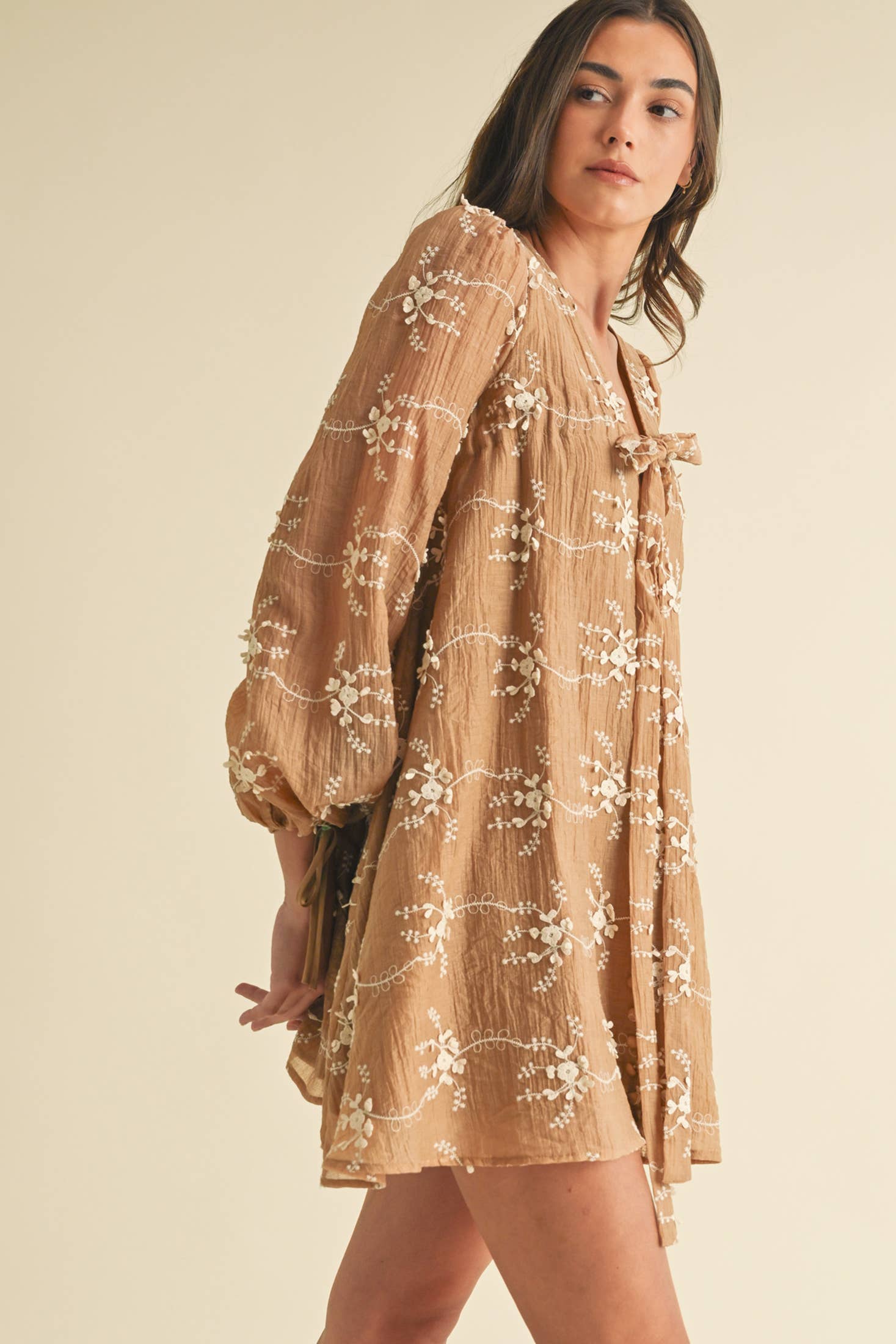 Feminine and effortlessly flirty, this sheer floral mini dress is a dream for any romantic at heart. Designed with delicate 3D floral embroidery, this breezy silhouette features billowy balloon sleeves, a soft A-line shape, and a self-tie neckline for added charm. The semi-sheer fabric adds a touch of allure, making it perfect for everything from brunch dates to garden parties. Style it with tall boots or strappy sandals for a look that’s equal parts sweet and chic.